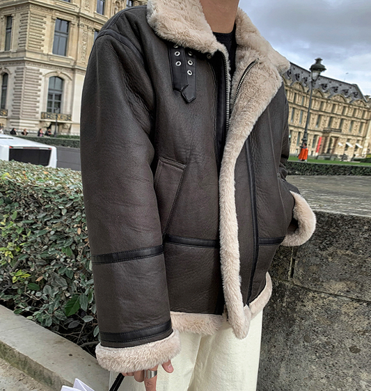 No. 3569 DARK BROWN FLEECE STAND COLLAR LEATHER JK