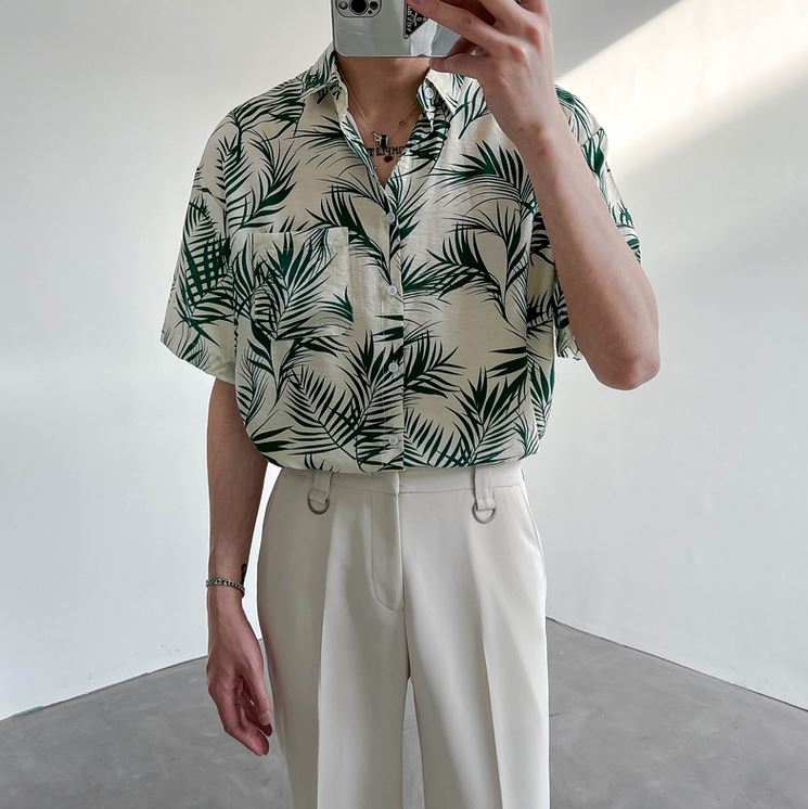 RT No. 4433 FLORAL LEAVES BUTTON-UP SHORT SLEEVE SHIRT