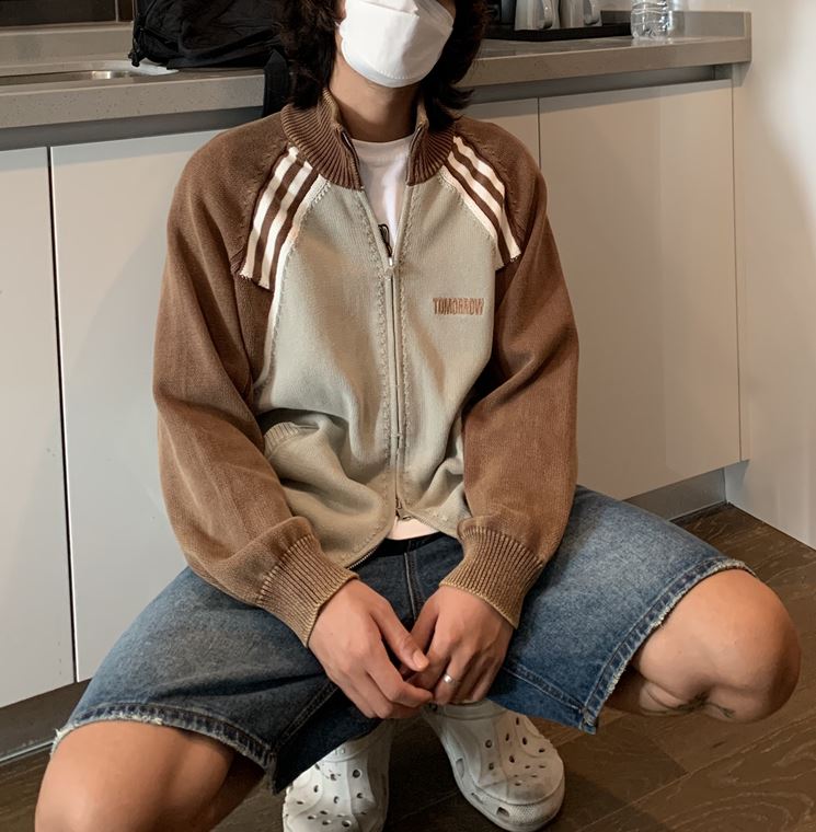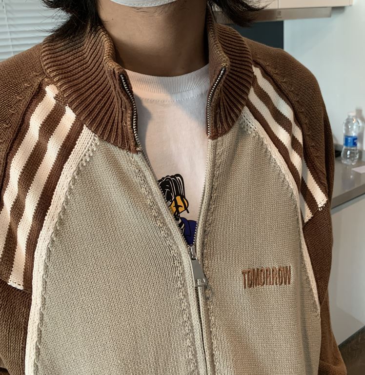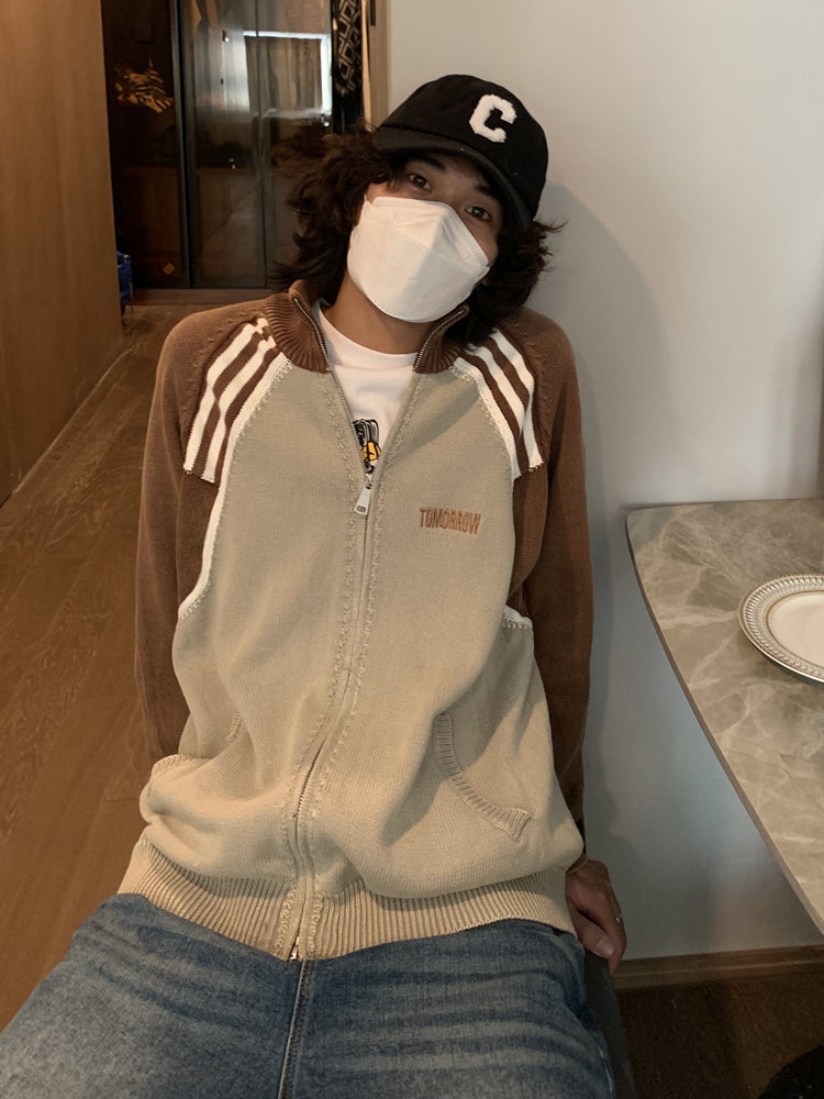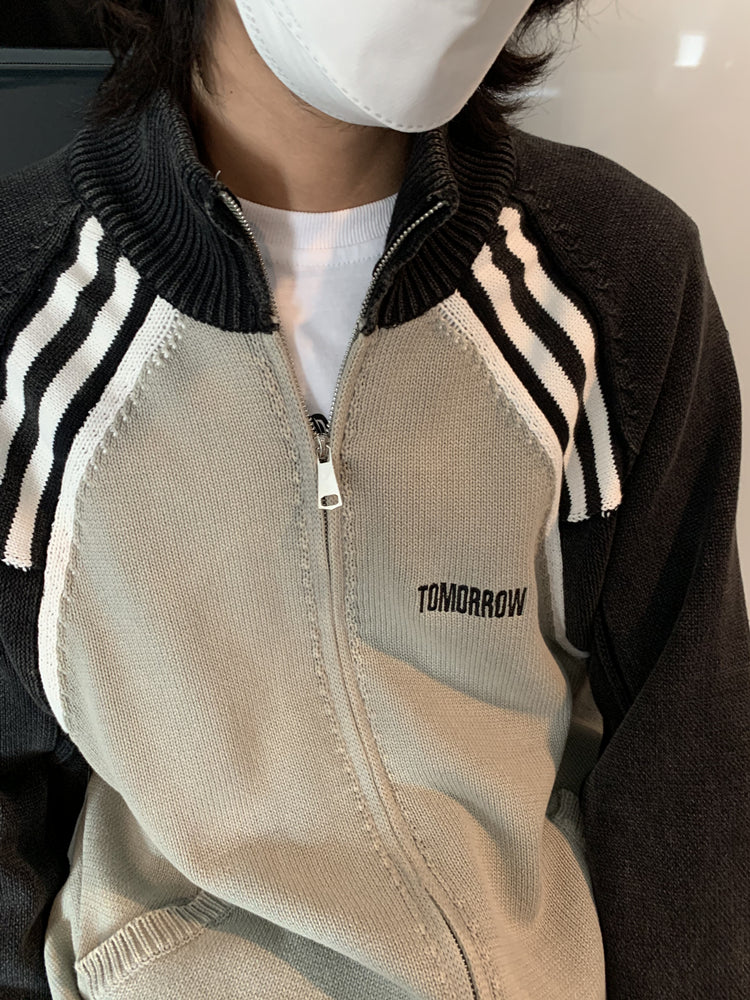 RT No. 5446 KNITTED COLLAR TWO-TONE ZIP-UP SWEATER